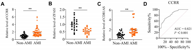 (A) The expression levels of lncRNA CCRR in whole blood samples from AMI patients and non-AMI subjects were comparatively analyzed using qRT-PCR. N = 68 for AMI and N = 69 for non-AMI subjects. (B and C) Circulating levels of lncRNA ZFAS1 (B) and CDR1AS (C). The expression levels of lncRNA ZFAS1 in whole blood samples; N = 21 for AMI and N = 23 for non-AMI subjects. The expression levels of lncRNA CDR1AS in whole blood samples; N = 25 for AMI and N = 30 for non-AMI subjects. Data are represented as means ± SEM; **P < 0.01 vs. Non-AMI. (D) The area under the ROC curve (AUC) was analyzed to determine the predictive power of circulating lncRNA levels for AMI using non-AMI subjects as control.