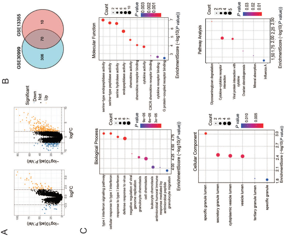 (A) Volcano map showing differentially expressed genes in GSE13355 and GSE30999 datasets. Orange color indicates high expression and blue low expression. (B) Venn diagram of the common differentially expressed genes (cross area) of GSE13355 and GSE30999 datasets. (C) Bubble map illustrating GO analysis (including biological process, cell component, and molecular function) and KEGG enrichment analysis of differentially expressed genes.