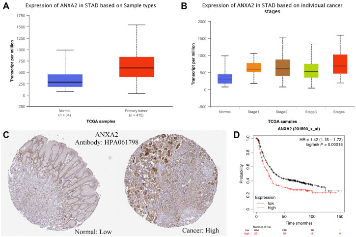 (A) Changes of ANXA2 mRNA expression levels in gastric cancer and normal gastric tissues; (B) Expression levels of ANXA2 mRNA in the tissues of gastric cancer patients at different clinical stages; (C) Immunohistochemical analysis of ANXA2 protein expression in gastric cancer and normal tissues; (D) Relationship between ANXA2 mRNA levels and the survival of gastric cancer patients.