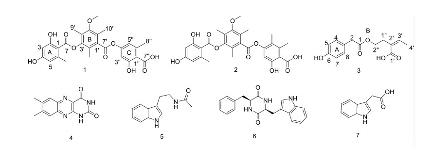[1] Liu Y B, Ding G Z, Li Y, et al. Structures and absolute configurations of penicillactones A–C from an endophytic microorganism, penicillium dangeardii pitt. Org. Lett, 2013; 15: 5206-5209. doi: 10.1021/ol4023485 [2] Liu Y B, Li Y, Qu J, et al. Eremophilane sesquiterpenes and polyketones produced by an endophytic guignardia fungus from the toxic plant gelsemium elegans. J. Nat. Prod, 2015; 78: 2149-2154. doi: 10.1021/np5009027 [3] Liu J Y, Zhao X, Liang X X, et al. Dothiorelone derivatives from an endophyte diaporthe pseudomangiferaea inhibit the activation of human lung fibroblasts MRC-5 cells. Fitoterapia, 2018; 127: 7-14. doi: 10.1016/j.fitote.2018.04.009 [4] Liu Y B, Li Y, Liu Z, et al. Sesquiterpenes from the endophyte glomerella cingulata. J. Nat. Prod, 2017; 80: 2609-2614. doi: 10.1021/acs.jnatprod.7b00054 [5] Liu Z, Zhao J Y, Sun S F, et al. Sesquiterpenes from an endophytic aspergillus flavus. J. Nat. Prod, 2019; 82: 1063-1071. doi: 10.1021/acs.jnatprod.8b01084 [6] Zou W X, Meng J C, Lu H, et al. Metabolities of colletorichum gloeosrioides, an endophytic fungus in Artemisia mongolica, J. Nat. Prod, 2000; 63: 1529-1530. doi: 10.1021/np000204t [7] Bang S, Lee C, Kim S, et al. Neuroprotective glycosylated cyclic lipodepsipeptides, Colletotrichamides A-E, from a halophyte-associated fungus, Colletotrichu-m gloeosporioides JS419. J. Org. Chem, 2019; 84: 10999-11006. doi: 10.1021/acs.joc.9b01511 [8] Luo Y P, Zheng C J, Chen G Y, et al. Three new polyketides from a mangrove-derived fungus Colletotrichum gloeosporioides. J. Antibiot, 2019; 72: 513-517. doi: 10.1038/s41429-019-0178-8 [9] Yang Z D, Li Z J, Zhao J W, et al. Secondary metabolites and PI3K inhibitory activity of Colletotrichum gloeosporioides, a fungal endophyte of Uncaria rhynchophylla. Curr. Microbiol, 2019; 76: 904-908. doi: 10.1007/s00284-019-01707-7 [10] Pamela N K, Sergi H A, Armelle T T, et al. Augustin, Colletotrin: a sesquiterpene lactone from the endophytic fungus Colletotrichum gloeosporioides associated with Trichilia monadelpha. J. Chem. Sci, 2017; 72: 697-703. http://www.degruyter.com/view/j/znb.2017.72.issue-10/znb-2017-0058/znb-2017-0058.xml?format=INT [11] Vanessa M C, Maria L Z, Ioanis H L, et al. Antifungal compounds produced by Colletotrichum gloeosporioides, an endophytic fungus from Michelia champac. Molecules, 2014; 19: 19243-19252. doi: 10.3390/molecules191119243 [12] Inacio M L, Silva G H, Teles H L, et al. Antifungal metabolites from Colletotrichum gloeosporioides, an endophytic fungus in Cryptocarya mandioccana Nees (Lauraceae). Biochem. Syst. Ecol, 2006; 34: 822-824. doi: 10.1016/j.bse.2006.06.007 [13] Liu H X, Tan H B, Chen Y C, et al. Secondary metabolites from the colletotrichum gloeosporioides A12, an endophytic fungus derived from Aquilaria sinensis. Nat. Prod. Rep, 2018; 32: 2360-2365. doi: 10.1080/14786419.2017.1410810 [14] Andre A, Wojtowicz N, Toure K, et al. New acorane sesquiterpenes isolated from the endophytic fungus Colletotrichum gloeosporioides SNB-GSS07. Tetrahedron. Lett, 2017; 58: 1269-1272. doi: 10.1016/j.tetlet.2017.02.024 [15] Chen X W, Yang Z D, Sun J H, et al. Colletotrichine A, a new sesquiterpenoid from Colletotrichum gloeosporioides GT-7, a fungal endophyte of Uncaria rhynchophylla. Nat. Prod. Rep, 2018; 32: 880-884. doi: 10.1080/14786419.2017.1365071 [16] Li Y, Wei W, Wang R L, et al. Colletolides A and B, two new γ-butyrolactone derivatives from the endophytic fungus Colletotrichum gloeosporioide. Phytochem. Lett, 2019; 33: 90-93. doi: 10.1016/j.phytol.2019.08.004 [17] Zhao J Y, Wang X J, Liu Z, et al. Nonadride and spirocyclic anhydride derivatives from the plant endophytic fungus Talaromyces purpurogenus. J. Nat. Prod, 2019; 82: 2953-2962. doi: 10.1021/acs.jnatprod.9b00210 [18] Huneck S, Porzel A, Schmidt J, et al. A tridepside from Umbilicaria crustulosa. Phytochemistry, 1993; 32: 475-477. doi: 10.1016/S0031-9422(00)95022-2 [19] Zou W X, Meng J C, Lu H, et al. Metabolites of colletotrichum gloeosporioides, an endophytic fungus in artemisia mongolica. J. Nat. Prod, 2000; 63: 1529-1530. doi: 10.1021/np000204t [20] Gao T, Cao F, Yu H, et al. Secondary metabolites from the marine fungus Aspergillus sydowii. Chem. Nat. Compd, 2017; 53: 1204-1207. doi: 10.1007/s10600-017-2241-7 [21] Pedras M S, Yu Y, Liu J, et al. Metabolites produced by the phytopathogenic fungus Rhizoctonia solani: isolation, chemical structure determination, syntheses and bioactivity. Ztschrift. für Naturforschung, 2005; 60: 9-10. http://www.degruyter.com/dg/viewarticle.fullcontentlink:pdfeventlink/$002fj$002fznc.2005.60.issue-9-10$002fznc-2005-9-1010$002fznc-2005-9-1010.pdf/znc-2005-9-1010.pdf?t:ac=j$002fznc.2005.60.issue-9-10$002fznc-2005-9-1010$002fznc-2005-9-1010.xml [22] Gubiani J R, Teles H L, Silva G H, et al. Cyclo-(TRP-PHE) diketopiperazines from the endophytic fungus Aspergillus versicolor isolated from Piper aduncum. Quim. Nova, 2017; 40: 138-142. http://quimicanova.sbq.org.br/audiencia_pdf.asp?aid2=6521&nomeArquivo=AR20160256.pdf [23] Evidente A, Iacobellis N S, Sisto A. Isolation of indole-3-acetic acid methyl ester, a metabolite of indole-3-acetic acid from Pseudomonas amygdali. Experientia, 1993; 49: 182-183. doi: 10.1007/BF01989428 [24] Zucconi L, Canini F, Temporiti M E, et al. Extracellular Enzymes and Bioactive Compounds from Antarctic Terrestrial Fungi for Bioprospecting. Int. J. Env. Res. Pub. He, 2020; 17: 6459. doi: 10.3390/ijerph17186459 [25] Eleftheriou P, Geronikaki A, Petrou A. PTP1b Inhibition, A Promising Approach for the Treatment of Diabetes Type Ⅱ. Curr. Top. Med. Chem, 2019; 19: 246-263. doi: 10.2174/1568026619666190201152153 [26] Sharma B, Xing L X, Yang F, et al. Recent advance on PTP1B inhibitors and their biomedical applications. Eur. J. Med. Chem, 2020; 199: 112376. doi: 10.1016/j.ejmech.2020.112376 -