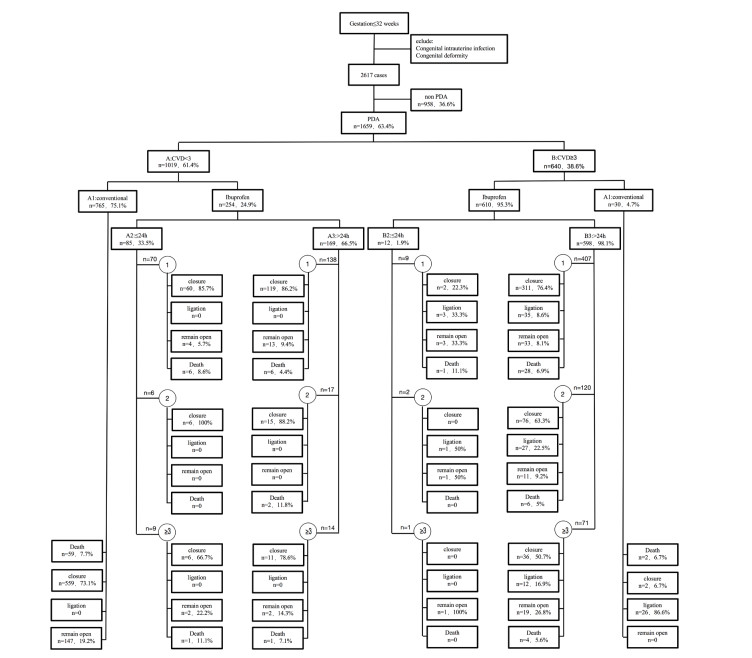 Objective There is a dilemma of ibuprofen treatment with patent ductus arteriosus (PDA) as to how and when to treat. We aimed to clarify this issue in very preterm infants (VPIs; < 32 weeks). Methods: This retrospective study included 1 659 VPIs who were diagnosed with PDA according to echocardiographic examinations and cardiovascular dysfunction scoring system (the CVD scoring). The VPIs were classified into six groups (A1, A2, A3, B1, B2, and B3) based on CVD scores (A, < 3, and B, ≥ 3), and treatment with ibuprofen for PDA (1, conservational management; 2, early ibuprofen treatment; and 3, late ibuprofen treatment). Treatment was stopped when PDA was closed, CVD score was zero or PDA needed ligation. Results: VPIs with CVD scores < 3 had most PDA closure without surgery, and early ibuprofen treatment did not significantly affect PDA closure. VPIs with CVD scores ≥ 3 had some PDA closure after 2 courses of treatment, but closure rates decreased linearly with ibuprofen course (1st 75.2%, 2nd 62.3%, 3rd 50.0%, P < 0.0001), and early ibuprofen treatment (group B2) did not increase PDA closure compared to late ibuprofen treatment (group B3). In these same infants, the longer they were in CVD scores ≥ 3, the more the complications of preterm were increased (retinopathy of prematurity ROP 1st 16.5%, 2nd 23.8%, 3rd 29.6%, P = 0.016; bronchopulmonary dysplasia BPD 1st 15.5%, 2nd 26.7%, 3rd 33.8%, P < 0.0001; intraventricular hemorrhage IVH 1st 20.4%, 2nd 32.4%, 3rd 23.8%, P = 0.015). Conclusion: Ibuprofen is suggested for PDA closure when the PDA reopens or has developed into the stage when the CVD score ≥ 3.