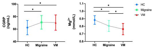 0(0-0.02)< 0.001* Note: CI, confidence interval; OR, odds ratio. CGRP, calcitonin gene-related peptide; Mg2+, Magnesium ions. *, P < 0.01. Table 4. ROC analysis results (AUC and Youden indices) for VM patients, migraine patients and control subjects