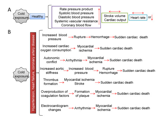 (A) In healthy controls, the cardiovascular responses are presented. (B) Cold induces dysregulation and increases the risk of cold-related cardiovascular events in subjects with hypertension, heart failure, and coronary artery disease.