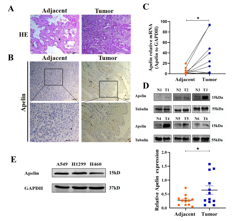 (A) HE staining of human NSCLC tissues and matched adjacent tissues. (B) Representative IHC imaging of apelin in NSCLC tissues. Scale bar, 50 μmol/L. (C) qRT-PCR analysis of apelin mRNA levels in human NSCLC tissues and paired adjacent tissues. N = 8, *P < 0.05. (D) Representative western-blot outcomes of apelin in 12 pairs of normal (N) and tumor (T) samples of NSCLC; Scatter diagram on the right panel represents relative apelin expression. N = 12, *P < 0.05. (E) Western-blot assay of apelin protein levels in three NSCLC cell lines was performed.
