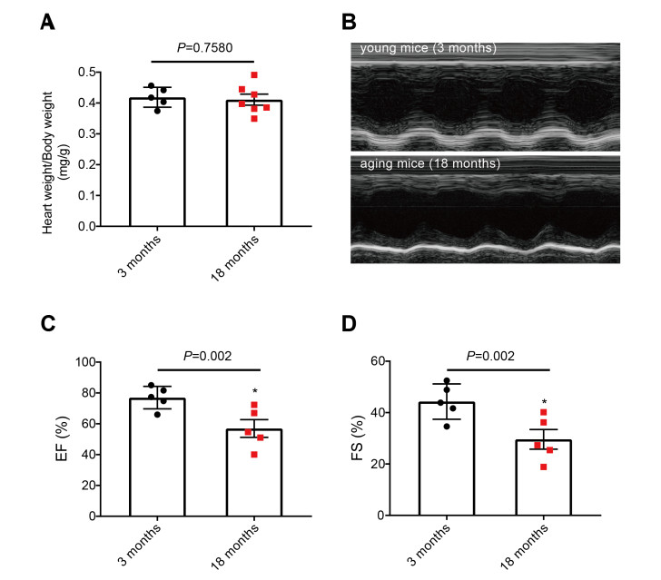 (A) There was no difference in the heart weight ratio between the aging mice (N = 7) and young mice (N = 5), and the cardiac function was determined by echocardiography (B-D), N = 5. Data are shown as mean ± SEM. *P < 0.05 vs. young mice.