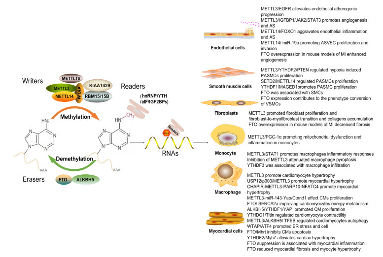 hnRNP, (nuclear inhomogeneous ribose protein); eIF, eukaryotic initiation factors; IGF2BPs, insulin like growth factor 2 mRNA-binding proteins; EGFR, epidermal growth factor receptor; JAK2, janus kinase 2; STAT3, (activator of transcription 3); FOXO1, forkhead box O1; ASVEC, atherosclerotic vascular endothelial cells; MI, myocardial infarction; PTEN. phosphatase and tensin homolog; SETD2, SET domain-containing 2; PASMCs, pulmonary artery smooth muscle cell; PGC-1α, peroxisome proliferator-activated receptor γ coactivator 1-α; STAT1, signal transducer and activator of transcription 1; USP12, ubiquitin specific proteinase 12; Ctnnd1, catenin delta 1; SERCA2a, sarcoplasmic/endoplasmic reticulum calcium ATPase 2a; YAP, yes-associated protein; TFEB, transcription factor EB; ATF4, activating transcription factor 4.