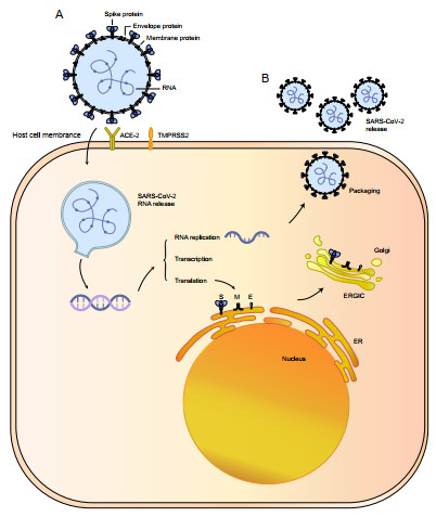 (A) Possible structural model of SARS-CoV-2; (B) The life cycle of SARS-CoV-2 in host cells: the S protein of SARS-CoV-2 forms a complex with the ACE2 receptor on the host cell membrane, with the help of proteases, the viral complex is then transported into the host cell, and the viral RNA is subsequently released into the cytoplasm. Spike (S), envelope (E), and membrane (M) proteins are translated in the ER of host cells. Viral RNA and S, M, and E proteins assemble in the ERGIC to generate a new SARS-CoV-2, which is then released from the host cell by exocytosis. ER, endoplasmic reticulum; ACE2, angiotensin-converting enzyme 2; SARS-CoV-2, severe acute respiratory syndrome coronavirus 2; TMPRSS2, transmembrane protease serine 2; ERGIC, endoplasmic reticulum-Golgi intermediate compartment.