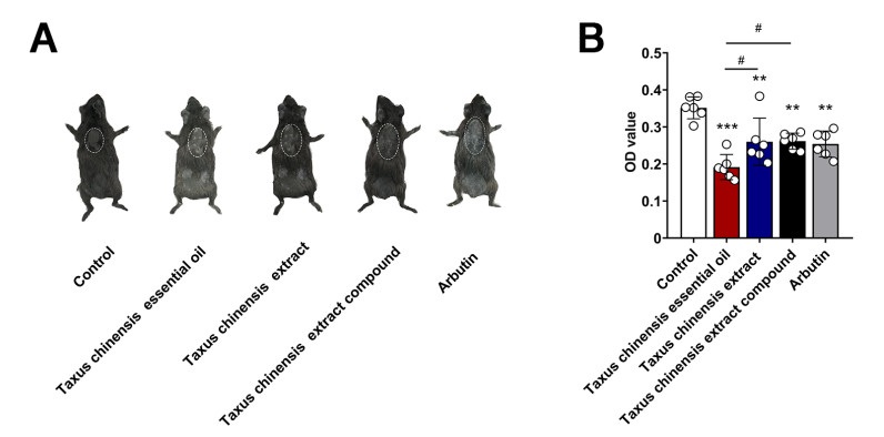 (A) Representative images of guinea pigs in each group after 28 days of administration; (B) Melanin content of back skin of guinea pigs in each group after 28 days of administration; Data represent the mean ± SE; **P < 0.01; ***P < 0.001 vs. Control group; #P < 0.05 vs. Taxus chinensis essential oil group.