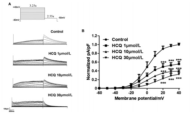 (A) Whole-cell voltage-clamp protocol and representative hERG current traces recorded from different experimental groups after expose of 1, 3, and 10 μmol/L HCQ. (B) Normalized I-V relationships for tail current in the presence of HCQ. N = 6, ***P < 0.001 vs. control.