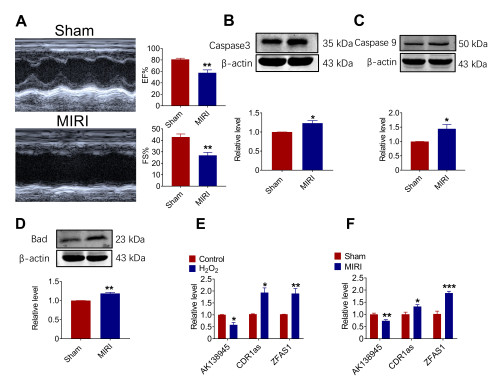 Figure 1. Expression of lncRNA-AK138945 in a mouse model of myocardial ischemia-reperfusion injury (MIRI). (A) Significant decreases in ejection fraction (EF) and fractional shortening (FS) in MIRI mice compared to the control group, indicating the successful establishment of the MIRI model. ** vs. Sham, P < 0.01, Sham, N = 6; MIRI, N = 4. (B-D) Western blot analysis on the expression levels of apoptotic proteins Caspase 9, Caspase 3, and Bad in myocardial tissue. * vs. Sham, P < 0.05; ** vs. Sham, P < 0.01, N = 3-5. (E) qPCR analysis on the expression of lncRNA-AK138945 in neonatal mouse cardiomyocytes after hydrogen peroxide treatment * vs. Control, P < 0.05; ** vs. Control, P < 0.01, N = 3. (F) Changes of lncRNA-AK138945 expression in cardiac tissue of MIRI model. * vs. Sham, P < 0.05; ** vs. Sham, P < 0.01; *** vs. Sham, P < 0.001, N = 3-4.